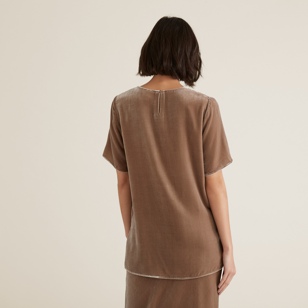 The Velvet Top features a soft textured body, oversized longline hem, drop shoulder short sleeve, and circle neckline. Perfectly paired with the Seed Velvet Slip Skirt, this co-ord will elevate your style. The Velvet Top is made from a lightweight single lined Silk/Viscose blend, available in sizes 6 through to 14. Our model wears a size 8 and is 176cm tall. Care instructions can be found inside of the garment.