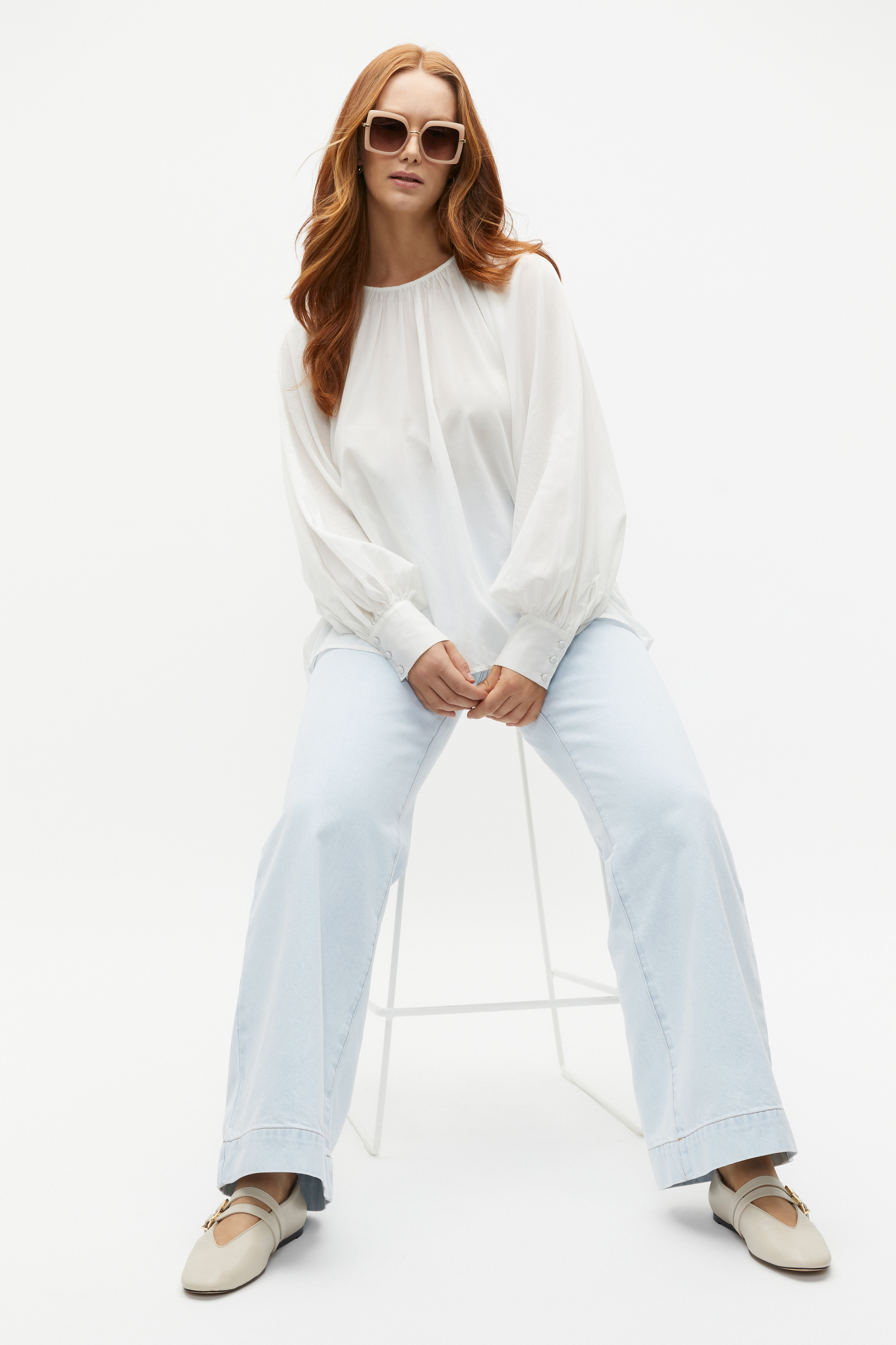 Update your summer styling with this voile blouse, complete with statement sleeves. With a lightweight and breezy feel, it features a round neck and a relaxed fit for an effortless and refined look. Secures with a button at the back of the neck.