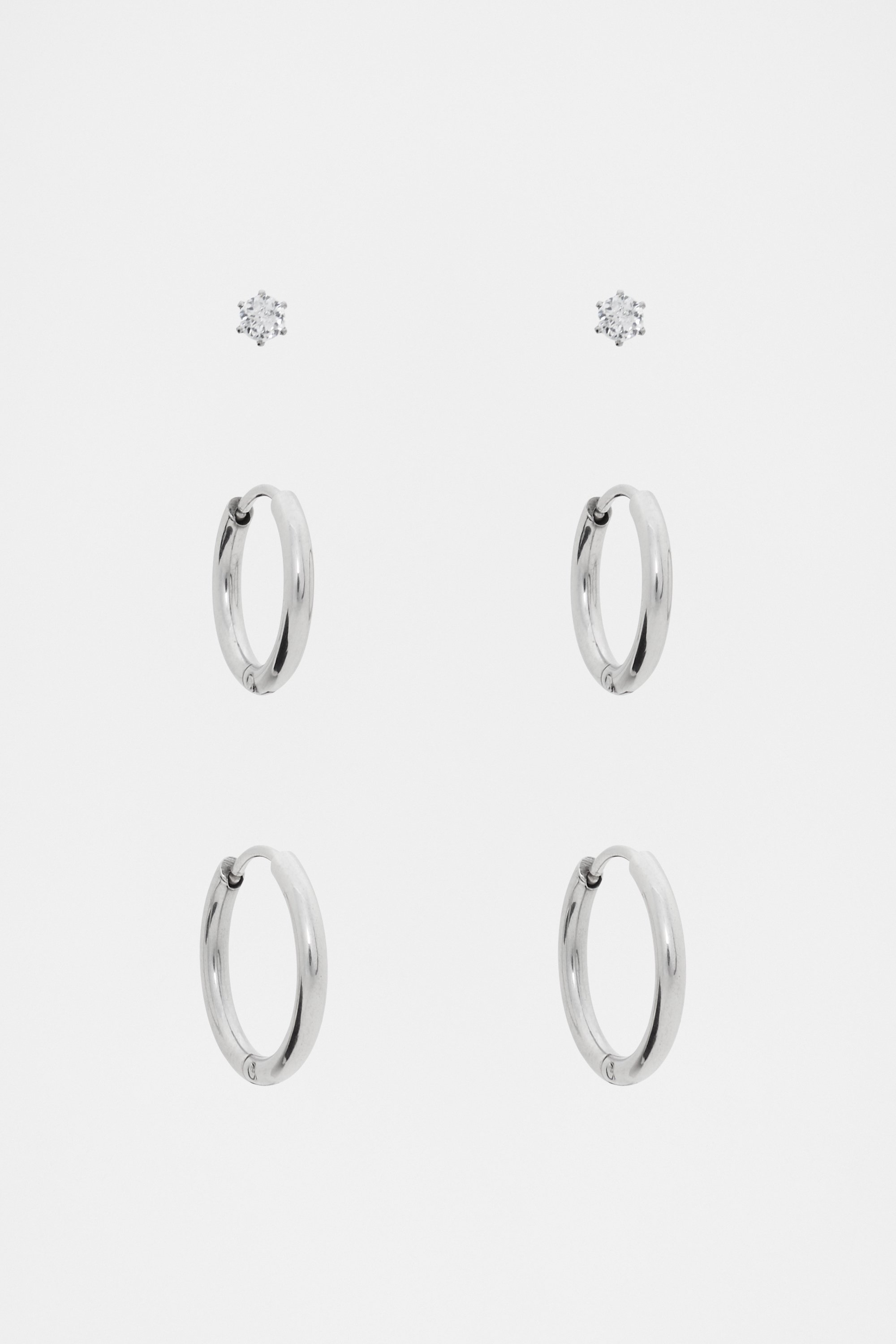 Elegant and understated, this earring set is ready for your everyday styling. Perfect to be worn together, the set features a simple stud design as well as two sets of small hoops. Discover pieces made to last with our collection of Physical Vapour Deposition (PVD) plated jewellery. Stainless steel pieces coated with PVD plating are safe to wear in water and offer enhanced protection against scratching, fading or tarnish for a smooth and lasting finish.