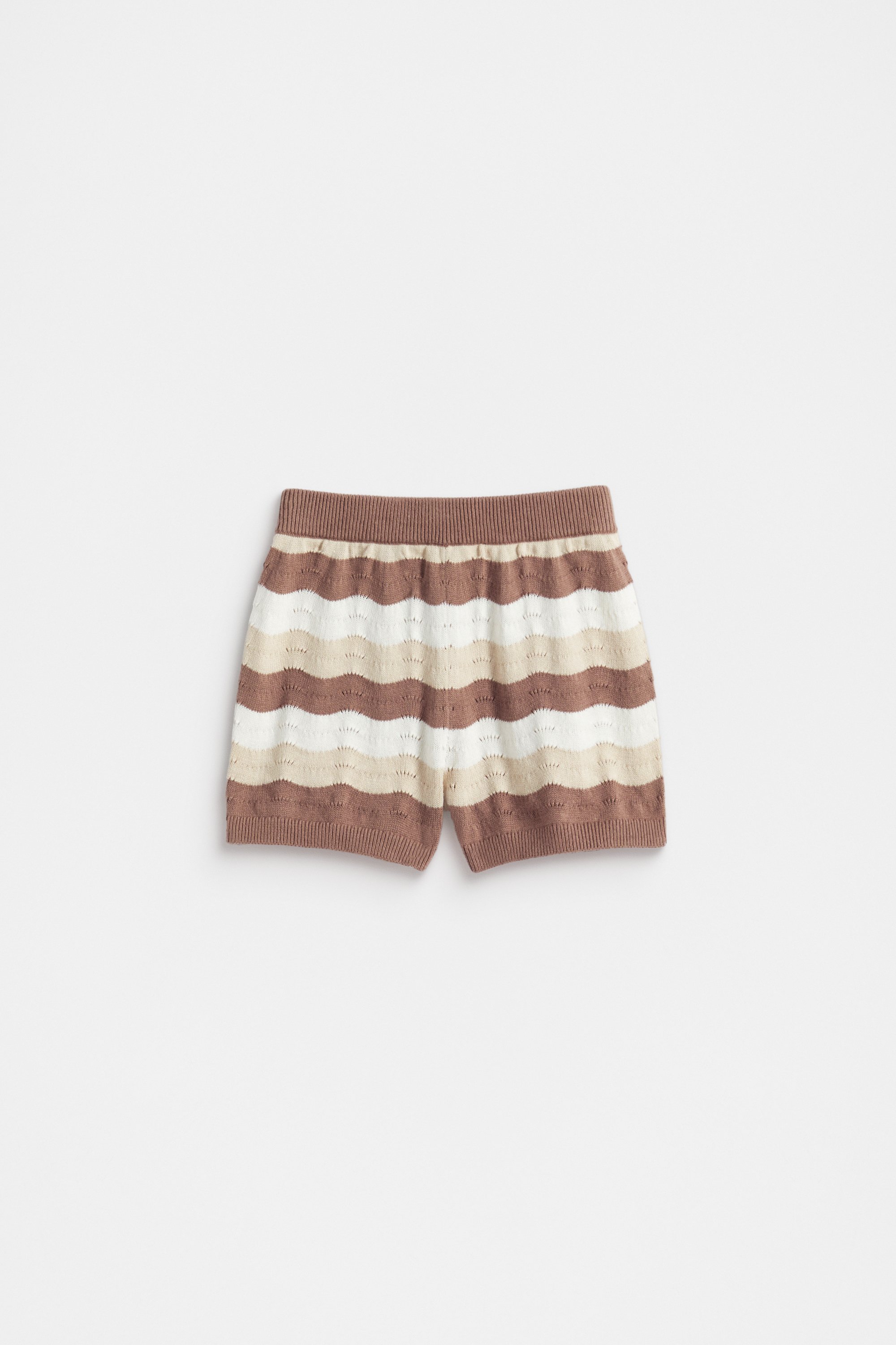 The sweetest little option, these knit shorts are crafted from breathable cotton with an elasticated waistband. They feature a wavy pattern with a textured knit, and can be paired with the matching jumper for a coordinated set.