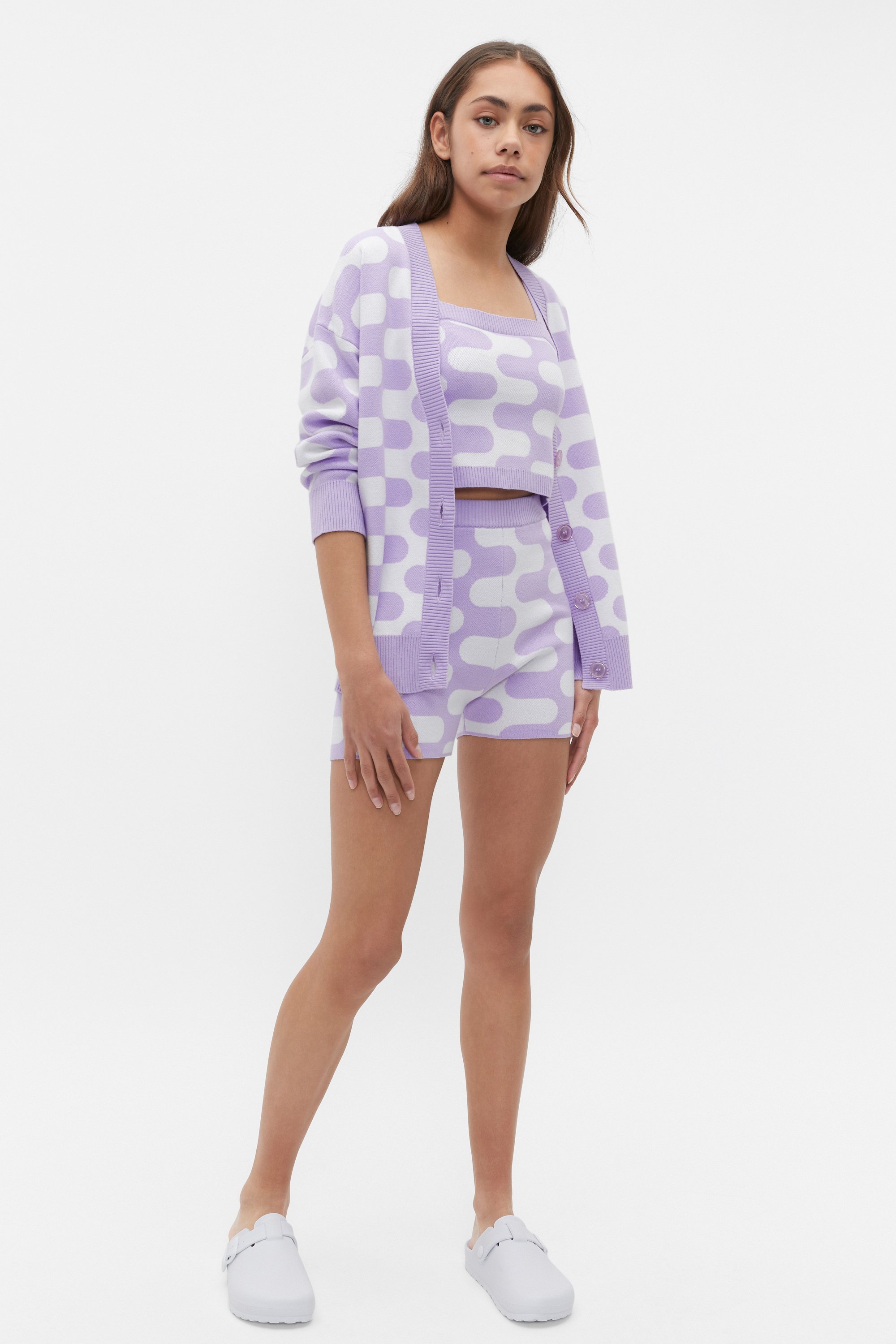 Add a bit of colour to her look with this knit top. It features wide straps, a straight neckline, and a neat fit. Finished with a statement wavy pattern and ribbed trims, it's crafted from a cotton blend with some stretch to it. It can be worn with the matching cardigan and knit shorts for a cool coordinated look.