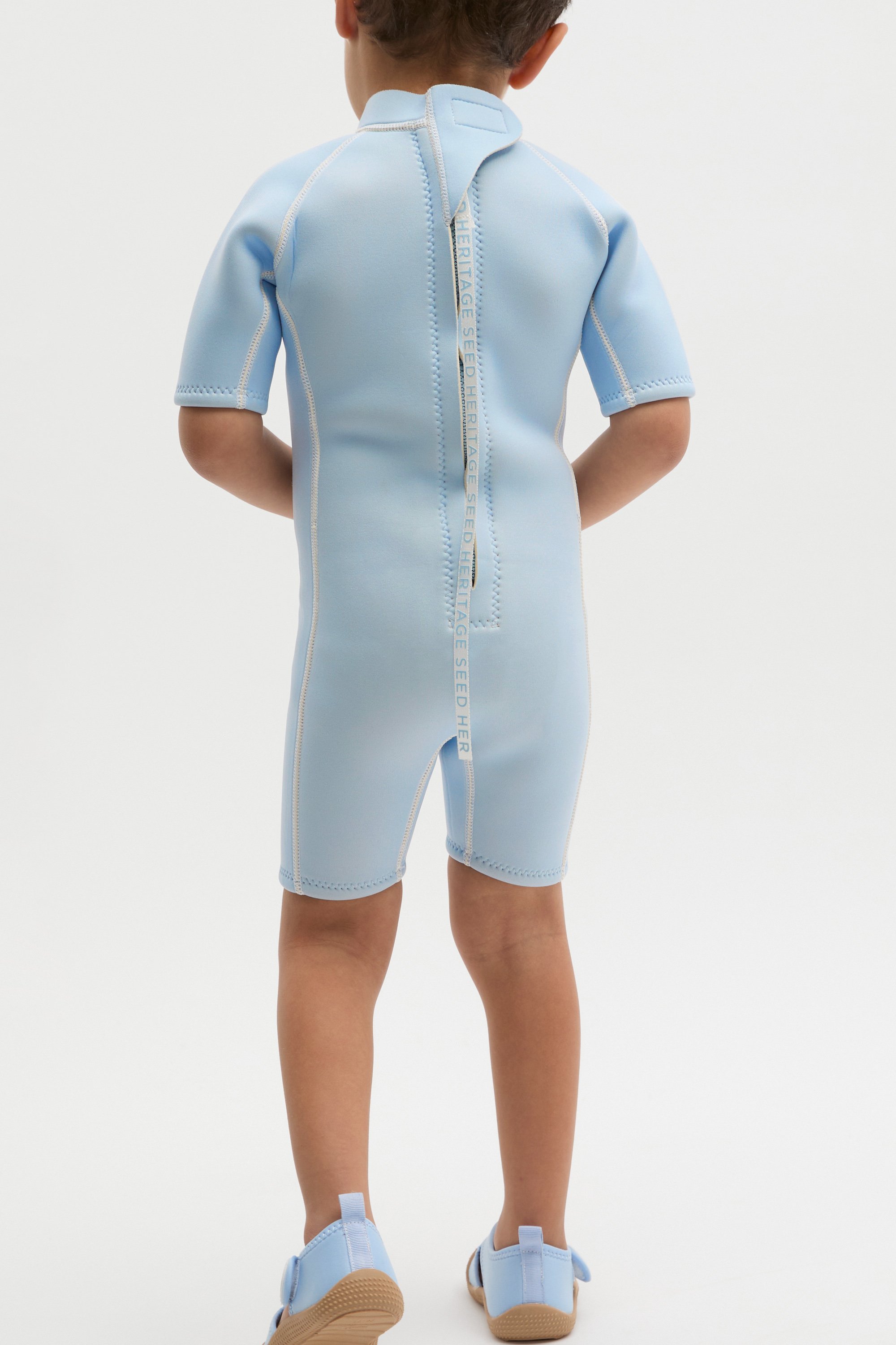 Comfortable and cool, this wetsuit brightens their swim day look. It features a round neck design with short sleeves and legs for easy wear. It secures with a zip and a hook-and-loop tab at the back of the neck. Pair with the matching aqua shoes.