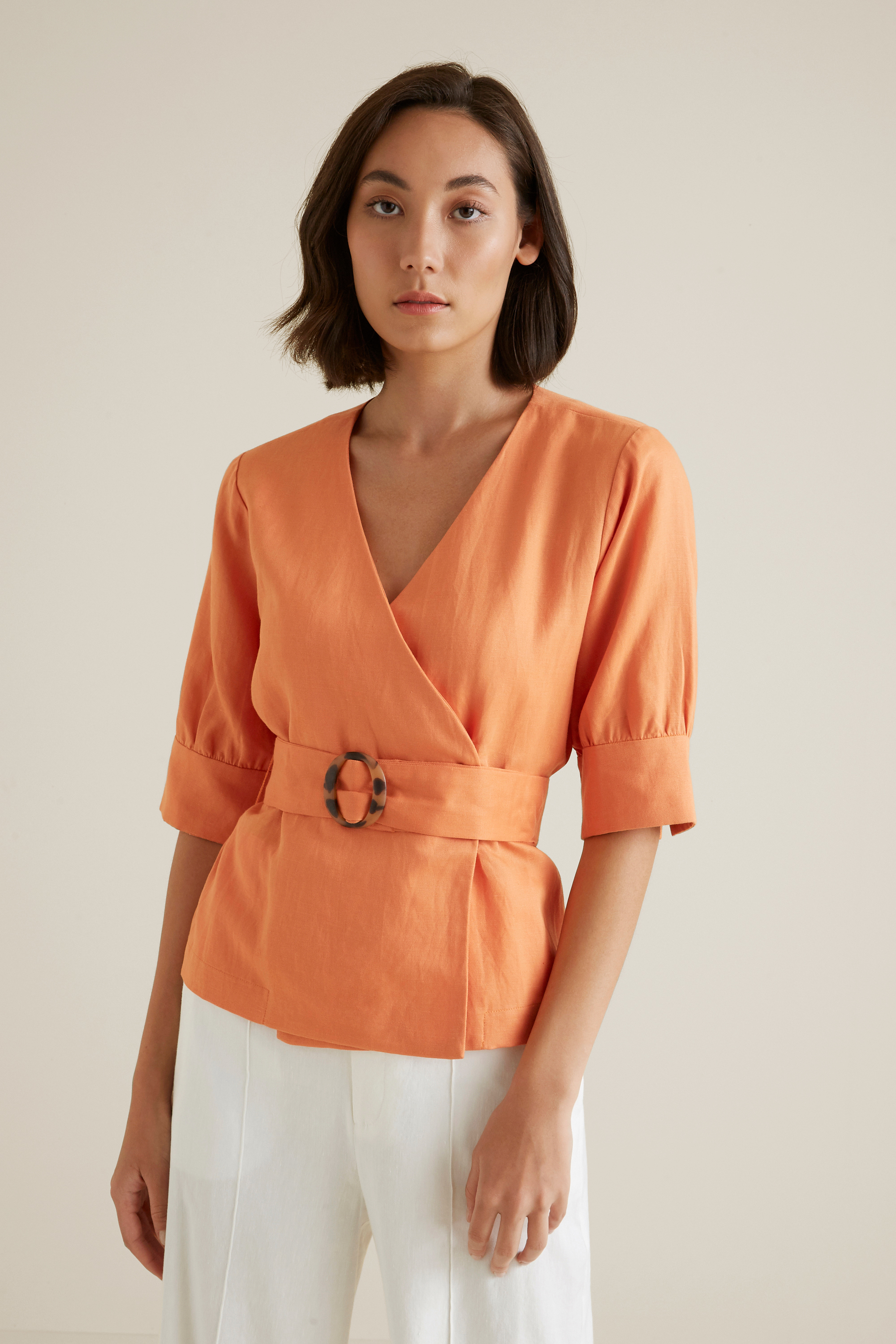 Incorporate a coastal silhouette to your summer edit, with this Wrap front Blouse. Designed with a plunging V neckline, this blouse is detailed with puff sleeves, belted waist and wrap closure. For your reference, our model is 176 cm tall and wears a size 8. Check the label inside of the garment for care instructions.