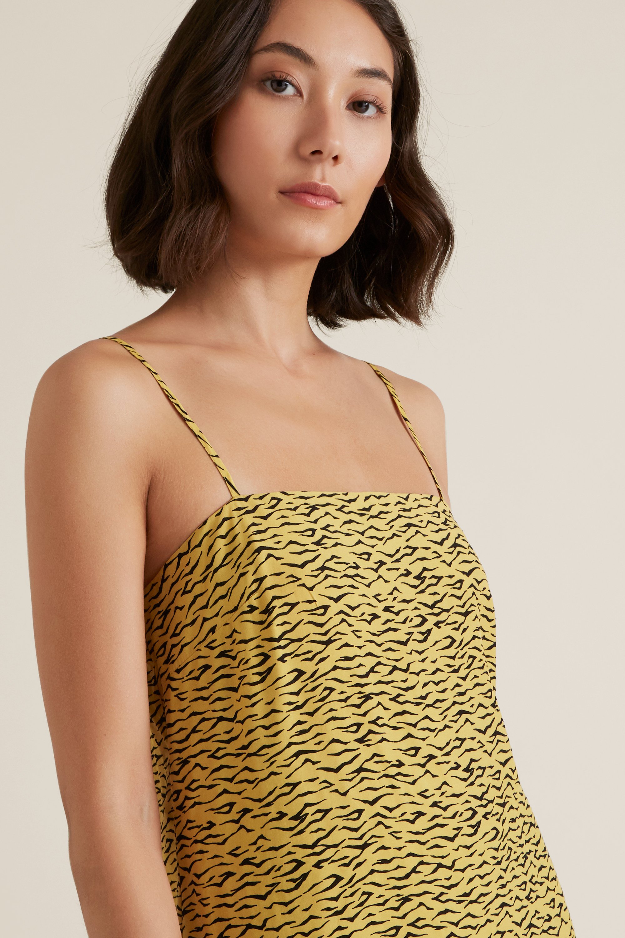This Zebra Print Cami sports a special occasion silhouette. Featuring a vibrant animal print, it boasts a square neckline, spaghetti straps and a boxy cropped hemline. Match with it's sister co-ord skirt for a sophisticated edge. Crafted from a Viscose blend, it is available in sizes 6 to 14. For your reference, our model is 176cm tall and wears a size 8. Please refer to the care label inside of the garment.